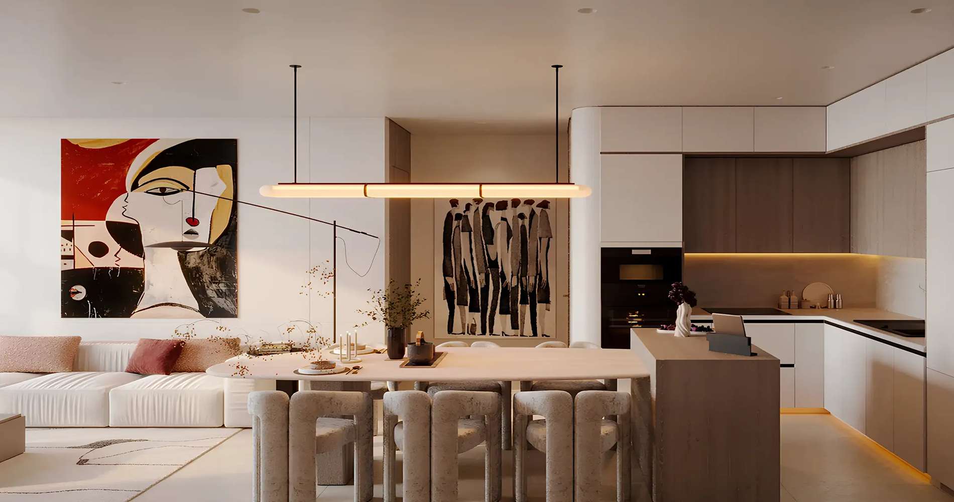 Emerging with a grand and extraordinary facade, this low-rise residential gem features a ground, a podium, and 5 floors. The exterior defines itself with a contemporary flair, where grand curves, neutral warm tones, stretched-out terraces and open glass facades are placed mindfully to form exquisite homes that focus on expensive and dynamic spaces. In each unit, interiors are warm and enticing with generously grand layouts. With unique sizes and configurations of homes, this building features a typical series of residences. The living room of every unit is openly conceived with a furnished seating zone, a dining zone, and a modern, well-equipped kitchen, while the huge windows capture stunning views and daylight inside the room.